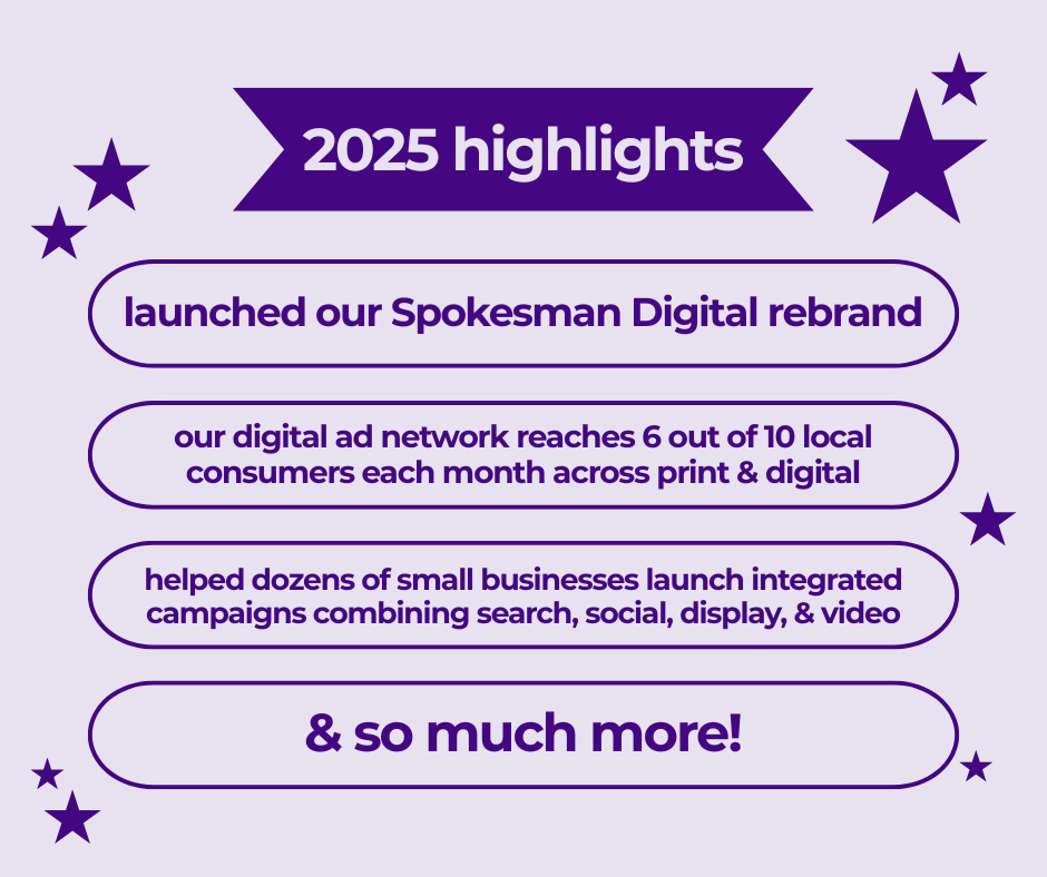 2025 has been a year of evolution for Spokesman Digital, and we couldn’t have done it without the continued support of our clients. From expanding our digital services to refining our omnichannel approach, we’ve made major strides in helping local businesses connect with their audiences in fresh, effective ways.